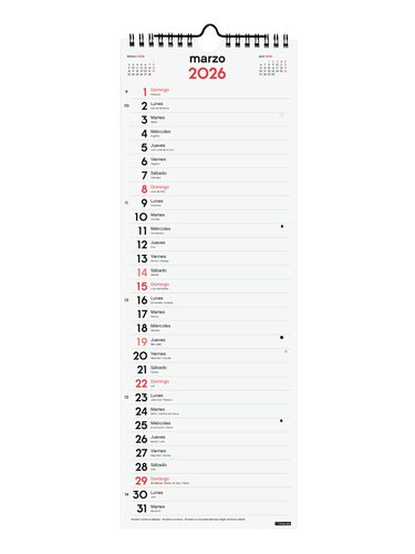 Calendario anual de pared encuadernado con espiral doble, papel FSC® ecológico de 120g/m² y colgador. Interior: festivos internacionales, fases lunares y cambios de estación.; calendarios reducidos de septiembre a diciembre del año anterior, planning anual, plantilla de horario, calendario anual del año y del año siguiente, listado de festivos internacionales y códigos de países. Medidas: 440 x 155 x 5 mm.